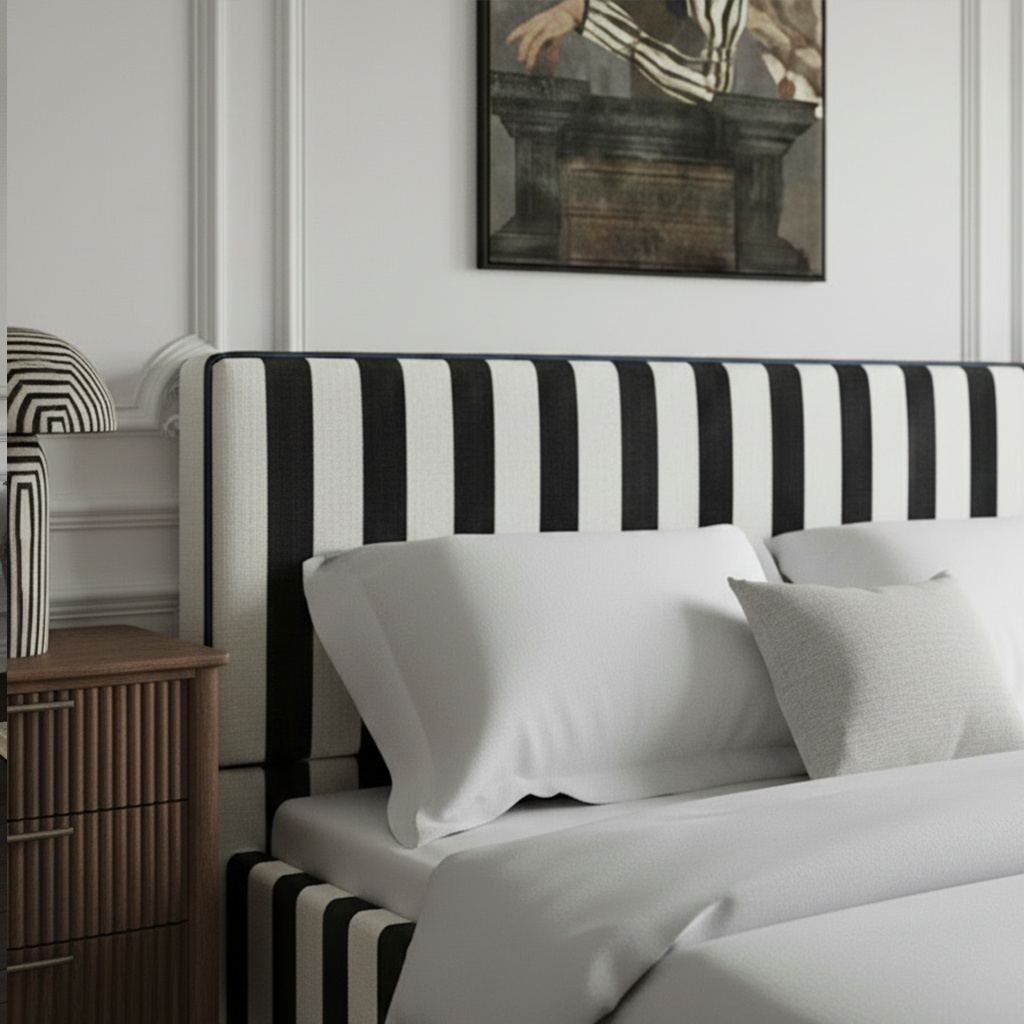 Cu o tăblie generoasă și tapițerie din materiale premium, Patul Atelier Domino oferă nu doar confort, ci și o prezență scenografică. Textura catifelată a țesăturii contrastează cu ritmul dungiilor, creând o senzație de ordine și profunzime. Este o piesă ideală pentru interioare contemporane, eclectice sau clasice reinterpretate, unde fiecare detaliu vorbește despre bun gust și rafinament atemporal.