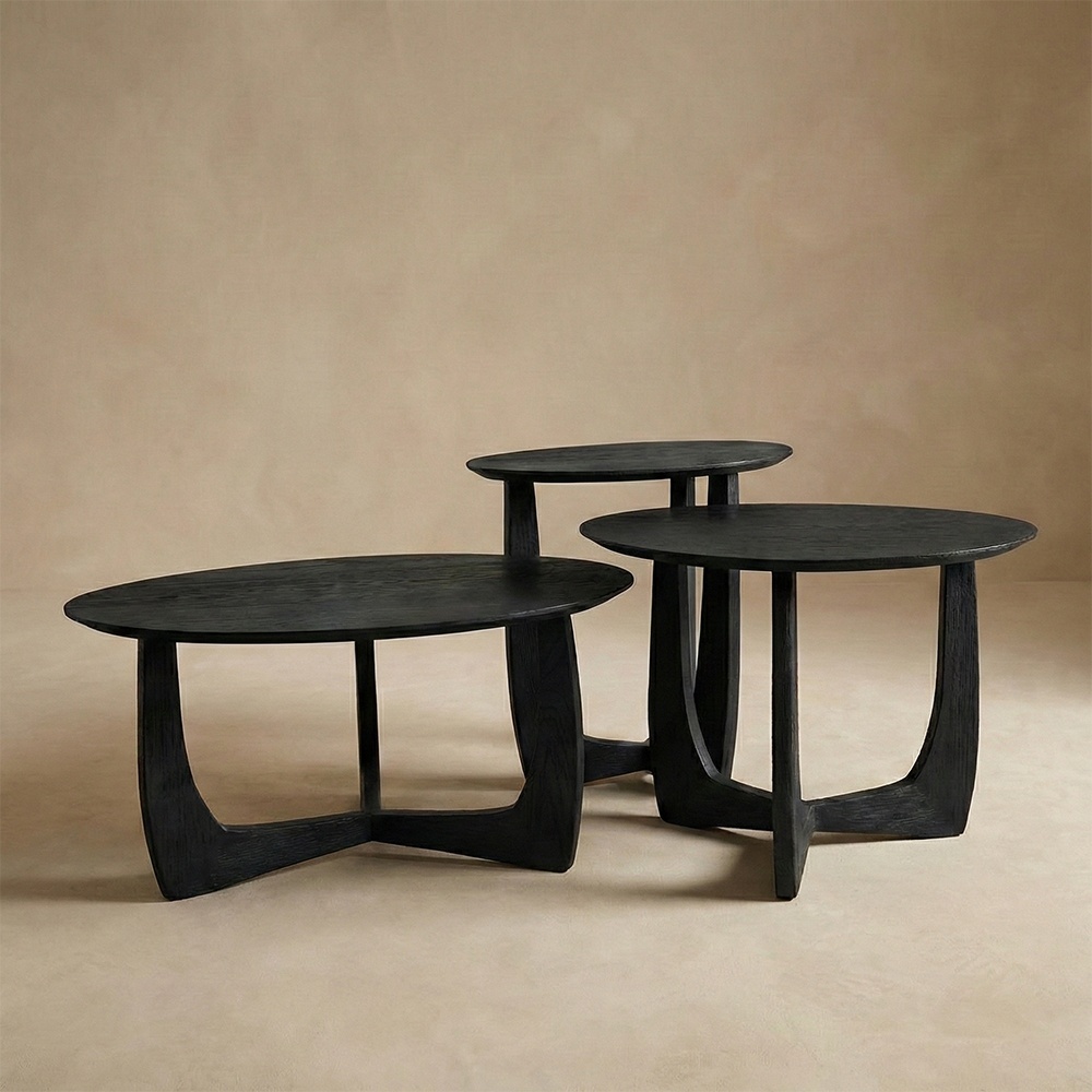 Renunță la rigiditatea unei singure mese de cafea și alege fluiditatea acestui set de trei măsuțe din stejar masiv. Inspirate de formele naturale ale pietrelor de râu (design pebble), aceste piese aduc un aer sofisticat și relaxat în același timp. Așa cum se observă în imagini, setul este compus din trei elemente cu înălțimi și dimensiuni diferite, permițând o aranjare în cascadă (nesting) care oferă profunzime vizuală spațiului.