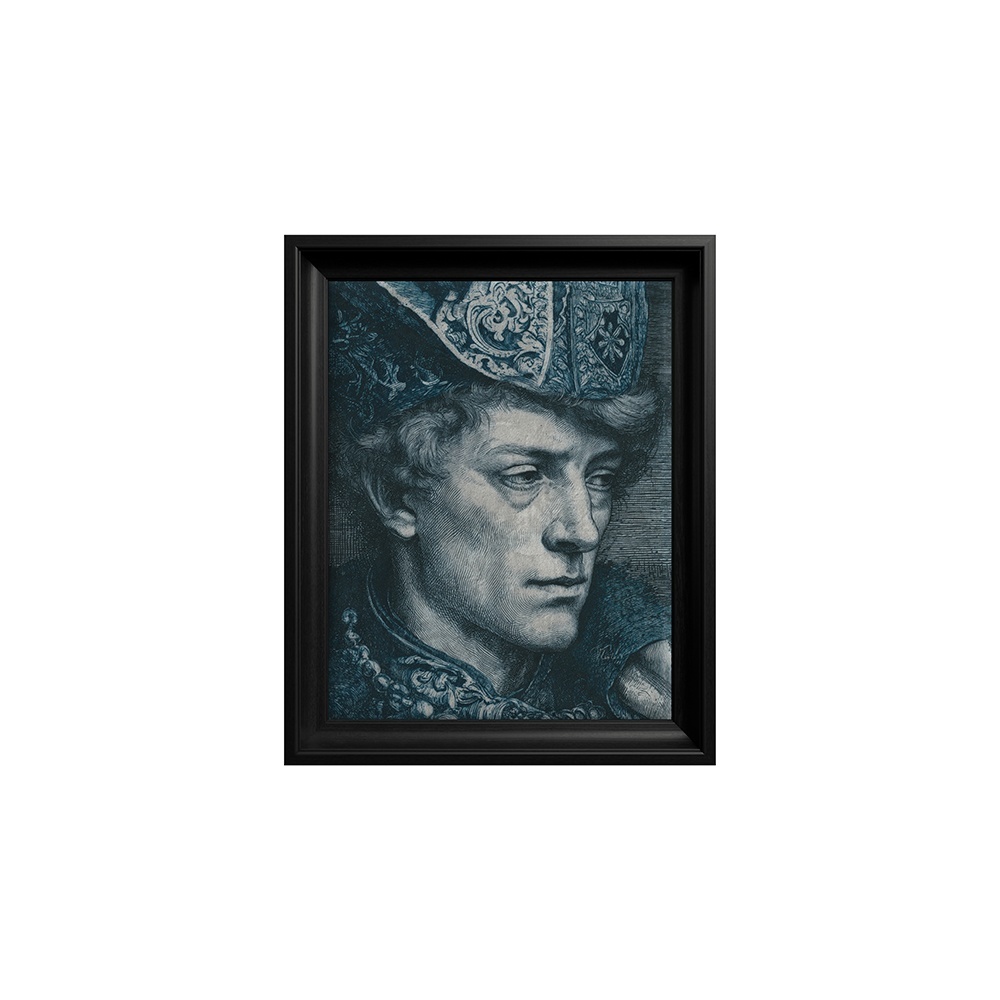 Executat în nuanțe profunde de albastru cobalt, tabloul înfățișează chipul unui nobil înveșmântat în detalii bogat ornamentate – o coroană decorată cu motive florale și bijuterii minuțios gravate. Privirea sa hotărâtă, dar introspectivă, sugerează atât puterea conducătorului, cât și fragilitatea umană, invitând privitorul la reflecție asupra dualității dintre autoritate și sensibilitate.