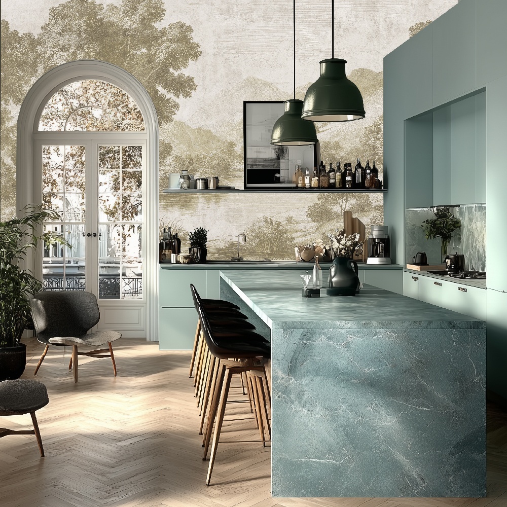 În nuanțe de albastru cețos, terracotă pământească și verdeuri estompate, designul echilibrează calmul cu o eleganță decadentă. Fiecare tușă poartă lirismul meșteșugului, iar rezultatul este o murală intimă și totodată monumentală. Atmosfera e una de reverență — parcă însăși istoria șoptește în tonuri domoale pe pereții tăi.