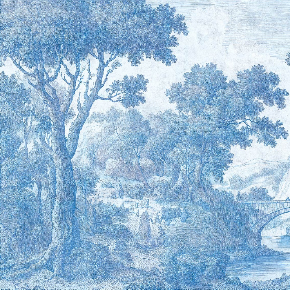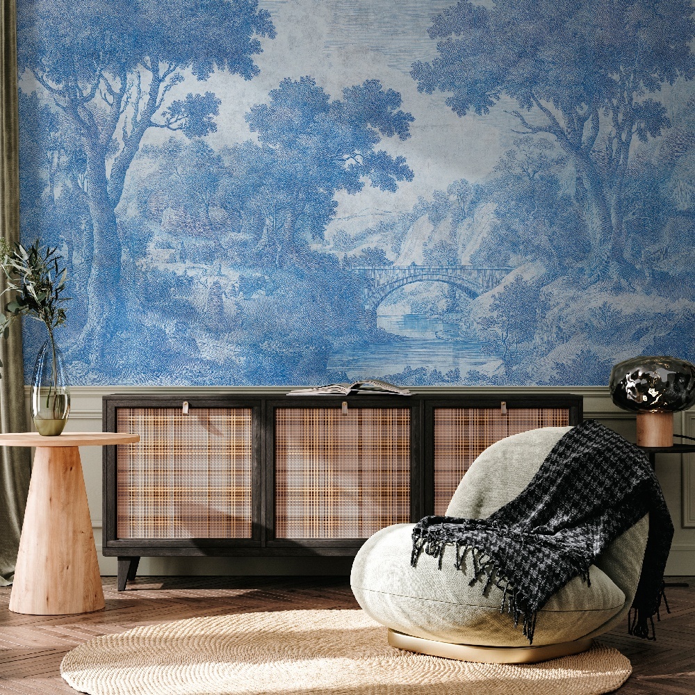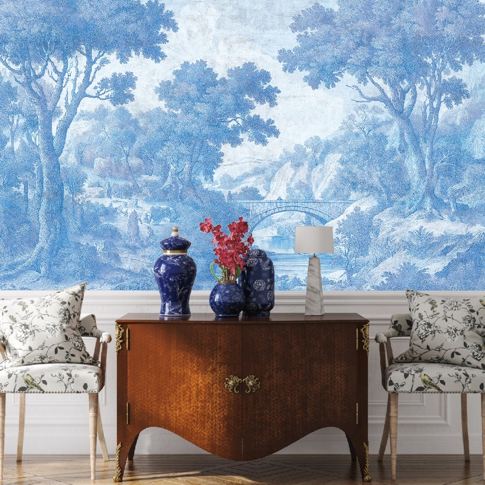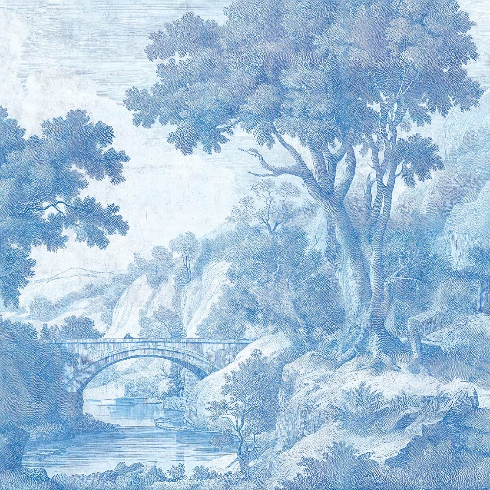 Memory Bridge Wallpaper este o odă lirică a conexiunii — între trecut și prezent, pământ și cer, structură și spirit. Pictat manual în nuanțe de albastru estompat, terracotta cald și tonuri aurii subtile. Muralul înfățișează un arc elegant peste apă. Este un simbol al trecerii și al reflecției.