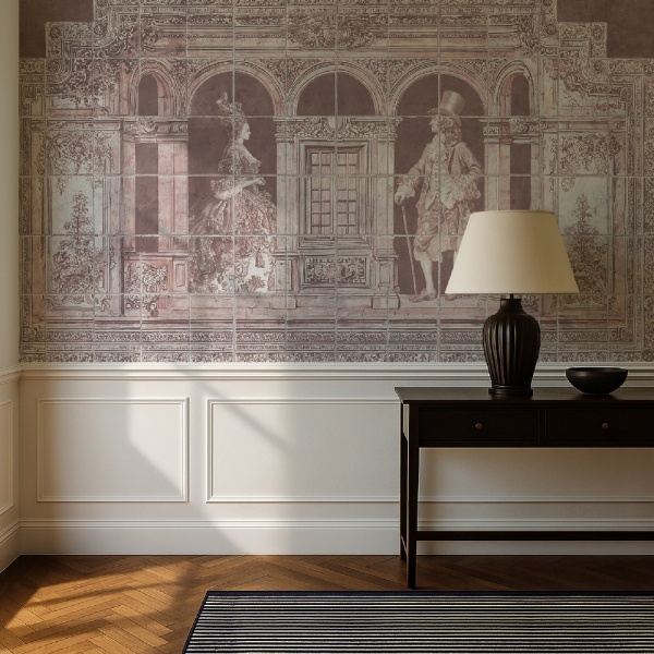 Redat în nuanțe calde de terracotta, auriu discret și accente de albastru de miez de noapte, Palace Masquerade Rose evocă interioarele fastuoase ale festivităților palatice. VLAdiLAmeșteșugarii surprind tensiunea dintre eleganță și exces, creând un mural care transformă interioarele în scene de splendoare atemporală.